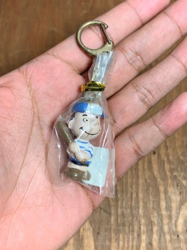 VINTAGE PEANUTS KEY-CHAIN, LINUS WITH BASEBALL BAT, DEAD-STOCK, WHITE/BLUE