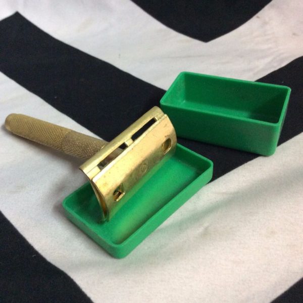Vintage razor kit, portable, double edged, deadstock, NOS, gold/green