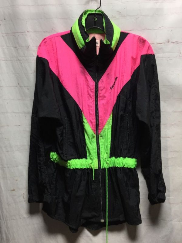 Vintage Reebok windbreaker jacket, nylon, zip-up, drawstring waist, embroidered logo on left chest, neon colored color-block design, neon pink/neon green/black, size S