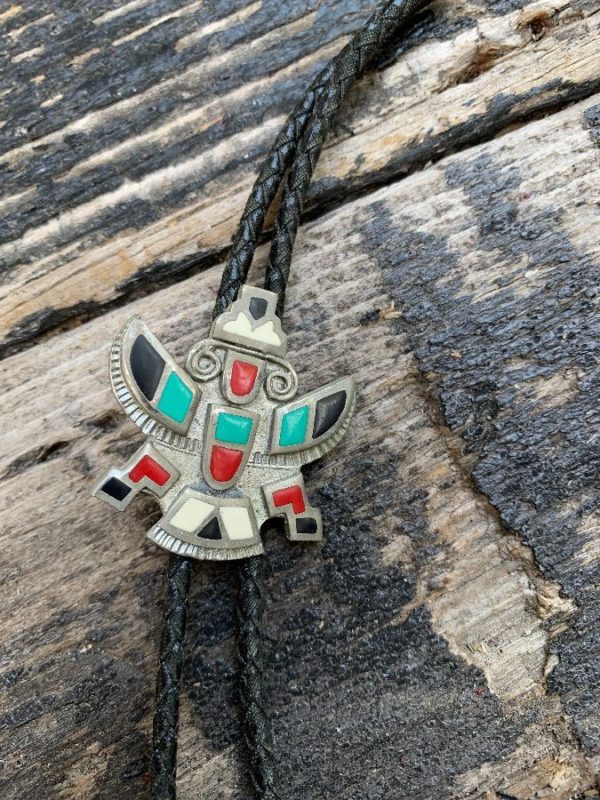 VINTAGE SOUTHWESTERN KATCHINA WARRIOR ENAMEL INLAY LEATHER CORD BOLO TIE