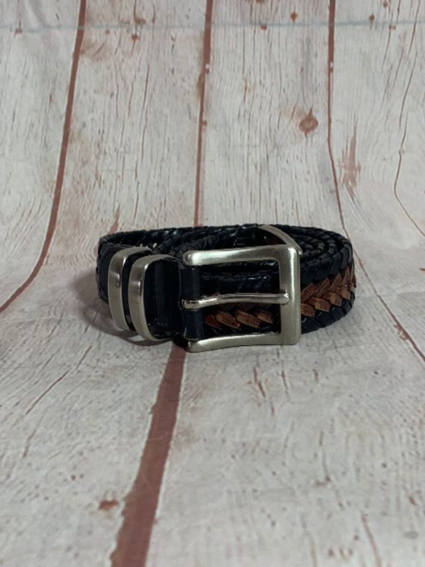 Vintage belt, woven leather, heavy silver metal hardware, black/brown/silver, size 36W