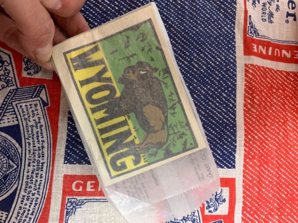 Vintage sticker, Wyoming decal, original wax paper package, green/yellow