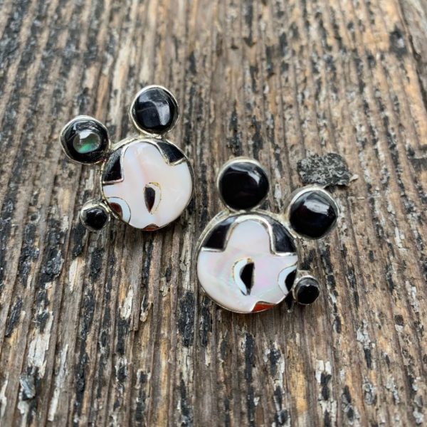 VINTAGE ZUNI INLAY MICKEY MOUSE STERLING SILVER STUD EARRINGS BLACK ONYX , SILVER , CORAL, ABALONE