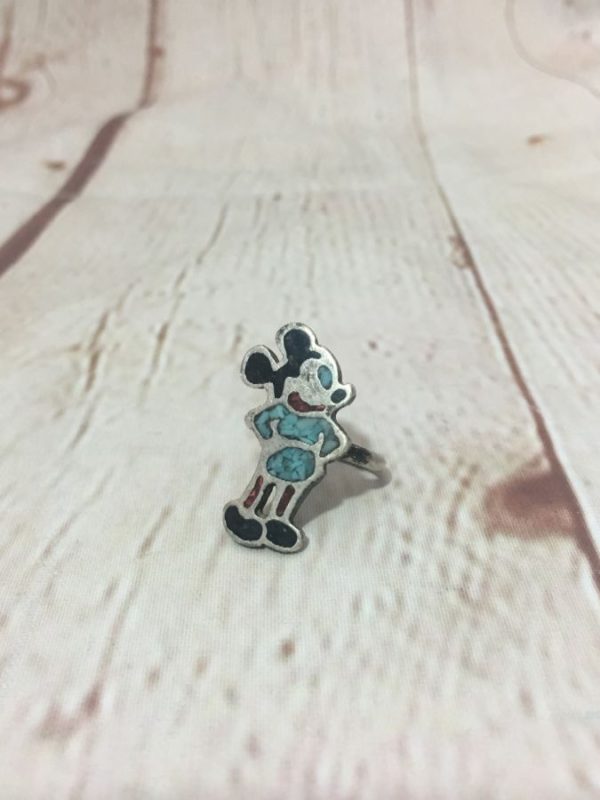 VINTAGE ZUNI STYLE STERLING SILVER MICKEY MOUSE TURQUOISE & CORAL RING
