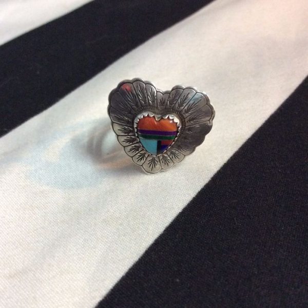 VINTAGE RING – STERLING – NAVAJO – TURQUOISE & CORAL HEART MOSAIC – SIGNED