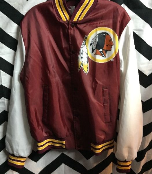 Washington Redskins Chalkline baseball jacket, button-up, Fanimation design, screen printed, maroon/white/yellow, size M