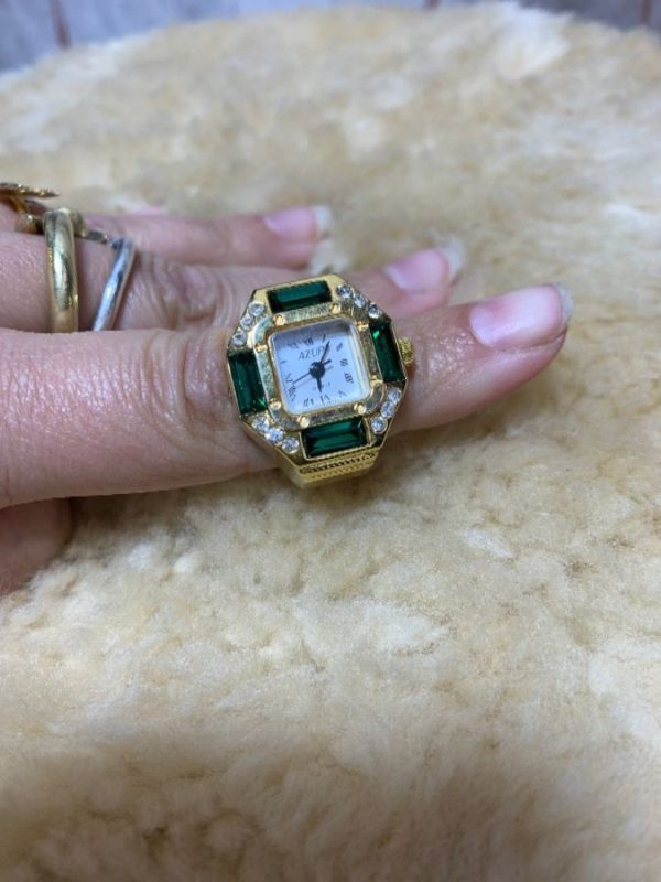 Watch/ring, square face, stretch band, rectangle emerald & diamond look stones around outside, gold/dark green/white, size adjustable