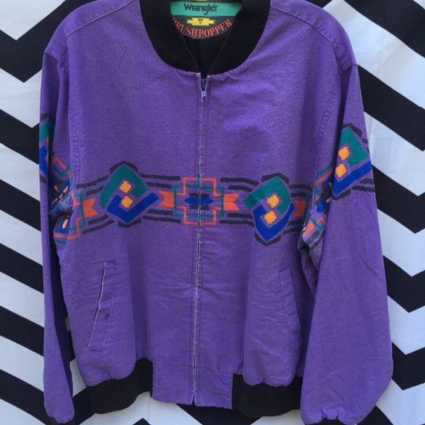 Wrangler Brush Popper jacket, wax twill, zip-up, horizontal stripe painted with Aztec graphic, purple/black/red/teal/yellow/blue, size M
