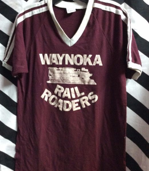 Waynoka Rail Roaders ringer T-shirt, screen printed, maroon/white, size XL