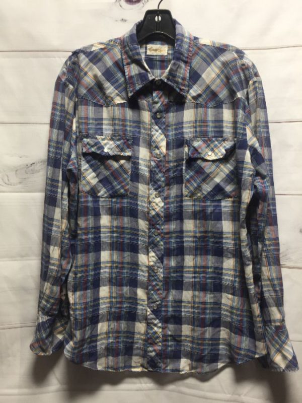 Country Square Western shirt, long sleeves, button-up with pearl snaps, plaid design, front pockets, blue/white/tan/red/navy blue, size L As is