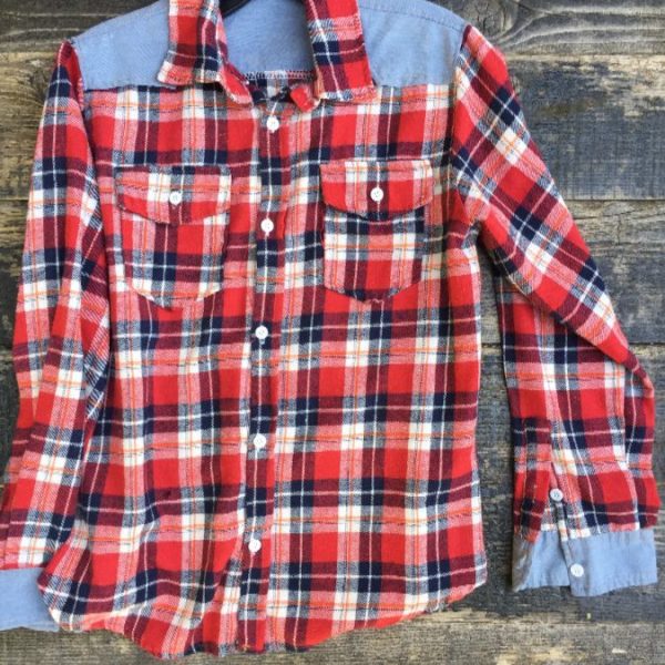 Western style flannel shirt, long sleeve, button-up, chambray shoulders and cuffs, 2 front pockets, plaid design, red/blue/white, size M