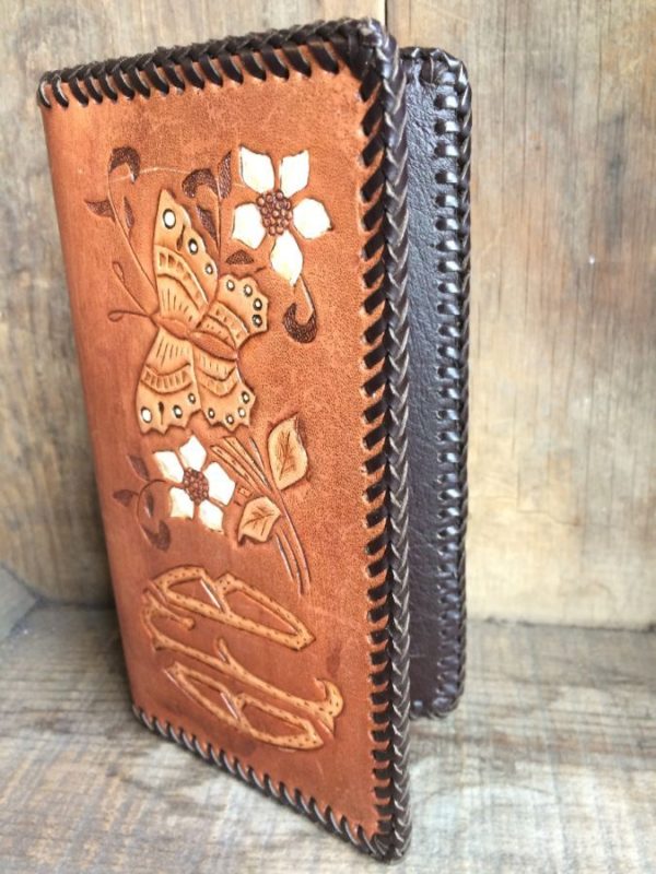 Checkbook cover, leather, hand tooled BFB with floral & butterfly design, whip stitched edges, dark brown/white/tan