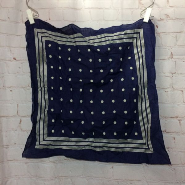 Bandana, square shape, polka dot design & a border with 3 triple line bands, navy blue/white