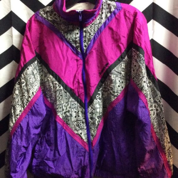 White Stag windbreaker jacket, zip-up, color block design, Aztec pattern strips, pink/purple/black/white, size L