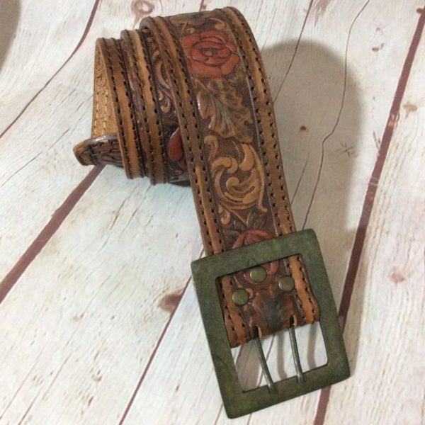 BELT – LEATHER – WIDE – EMBOSSED – SQUARE BRASS BUCKLE