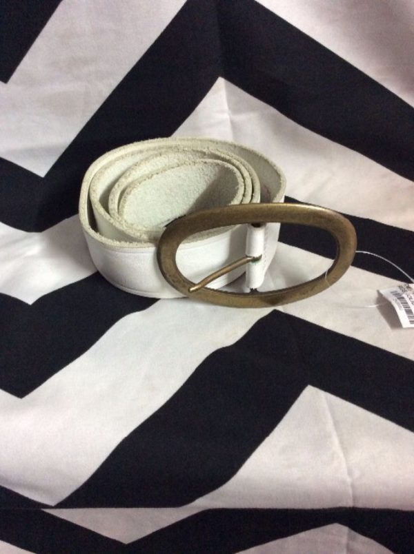 Belt, leather, wide, large solid brass oval buckle, white/brass, size L