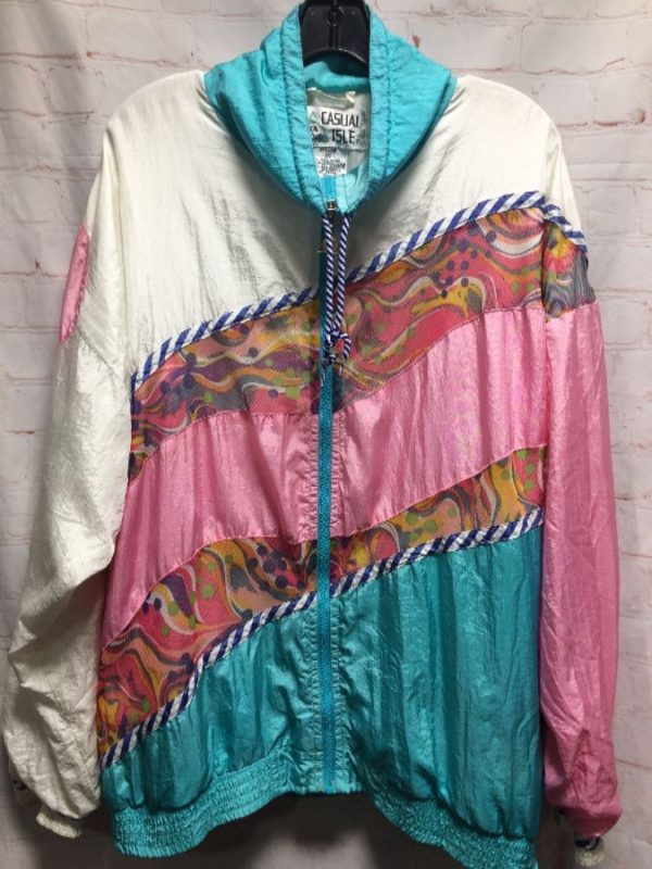 1980’s Casual Isle windbreaker jacket, nylon, zip-up, funky wild print mesh panels, color-block design, white/pink/turquoise/purple/green/orange, size XL