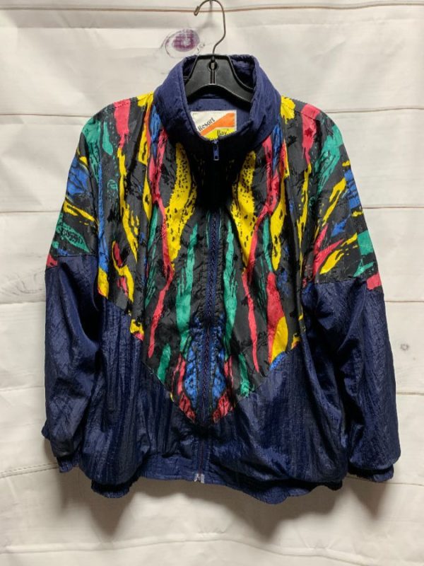 1990’s Resort Bay windbreaker jacket, nylon, zip-up, bright colored, vertical abstract shapes print in color-block design, wild pattern, blue/black/red/yellow/teal/navy blue, size L