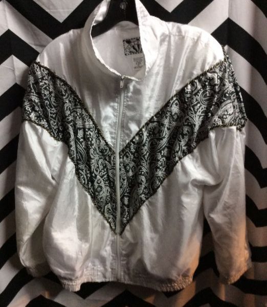 Windbreaker jacket, zip-up, color block design, bandana print, white/black, size L