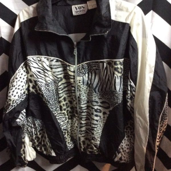 Windbreaker jacket, zip-up, animal print, color block design, black/white/gray, size M
