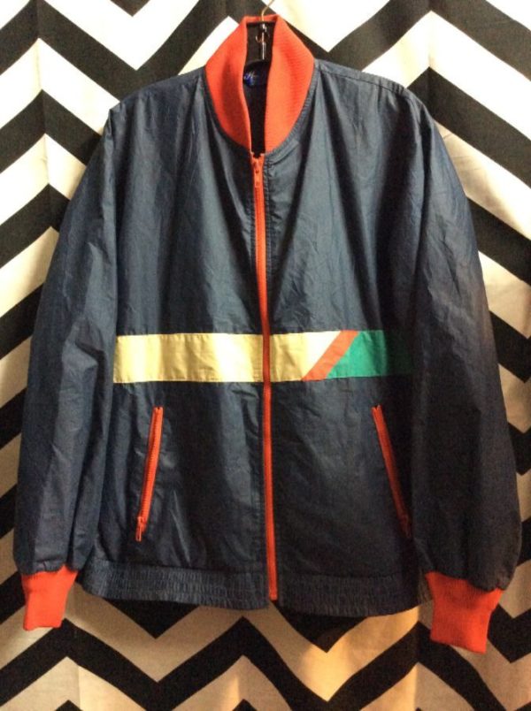 1970’S PEN WEST WINDBREAKER JACKET, ZIP-UP, COLOR BLOCK DESIGN WITH HORIZONTAL STRIPE, CONTRASTING TRIM, NAVY/CREME/RED/GREEN, SIZE M