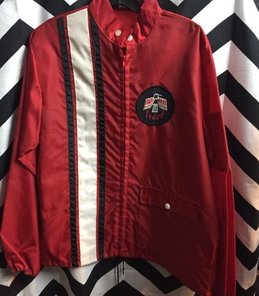 Windbreaker jacket, zip-up, Firebird patch, horizontal racing stripe down right side, red/white/black, size L