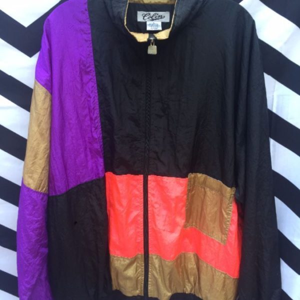 Windbreaker jacket, zip-up, color block design, neon colors, black/neon pink/neon purple/tan, size XL