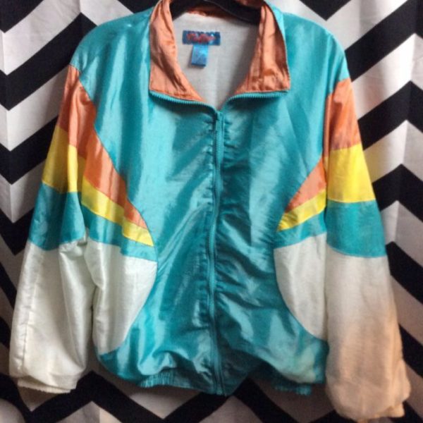 Windbreaker jacket, zip-up, pastel colors, sun burst color block design, turq/yellow/orange