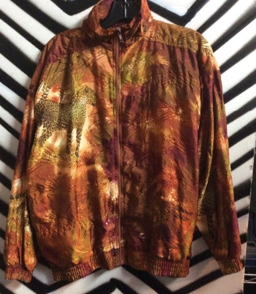 Windbreaker jacket, zip-up, safari print design, rust/browns