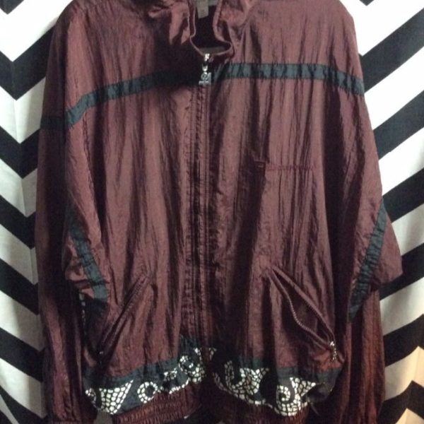 Windbreaker jacket, zip-up, horizontal stripe, Mozaic print design full back, maroon/black/pink/white, size M