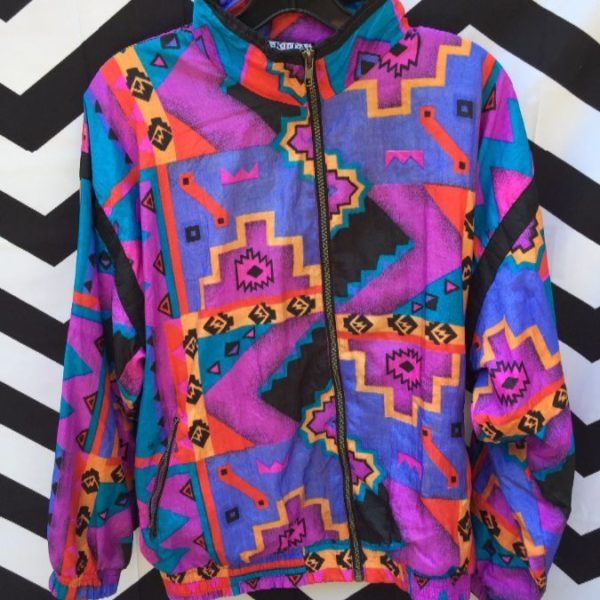 WINDBREAKER JACKET, NYLON, ZIP-UP, BRIGHT COLORED AZTEC DESIGN PRINT