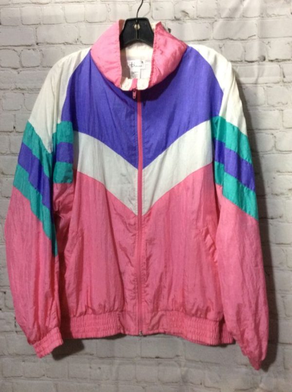 1980’s-1990’s Bocoo windbreaker jacket, zip-up, pastel color-block design, purple/pink/white/turq, size L