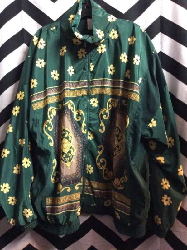 Windbreaker jacket, zip-up, Baroque design, Paisley pattern, green/gold, size L as is