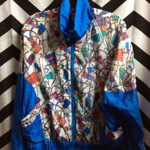 Windbreaker jacket, zip-up, rope & tassel pattern, color block design, blue/white/multi, size L