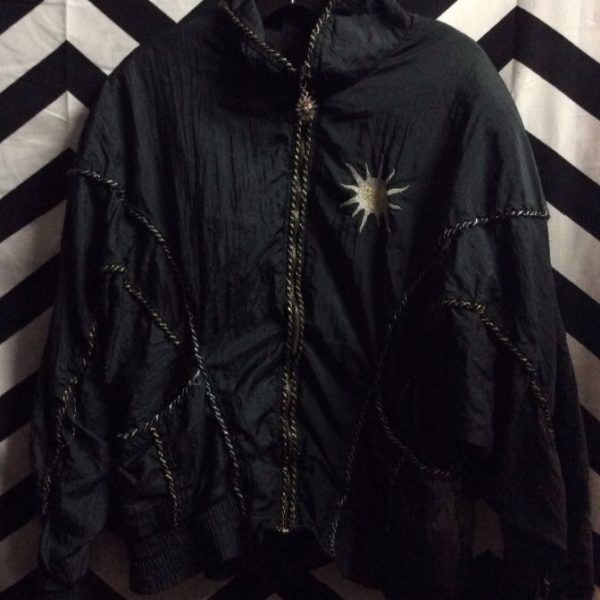 Windbreaker jacket, zip-up, rope trim detail, embroidered sun left chest, black/silver, size L