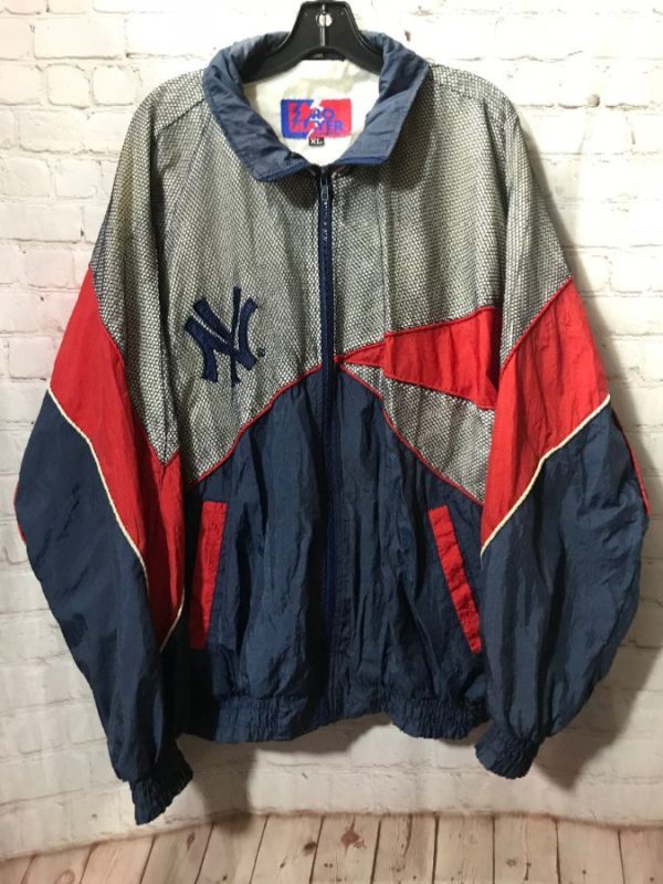 Pro Layer windbreaker/baseball jacket, zip-up, New York Yankees, color-block design with net fabric, embroidered team logo/Yankees & Official License logo, red/white/black/blue, size XL