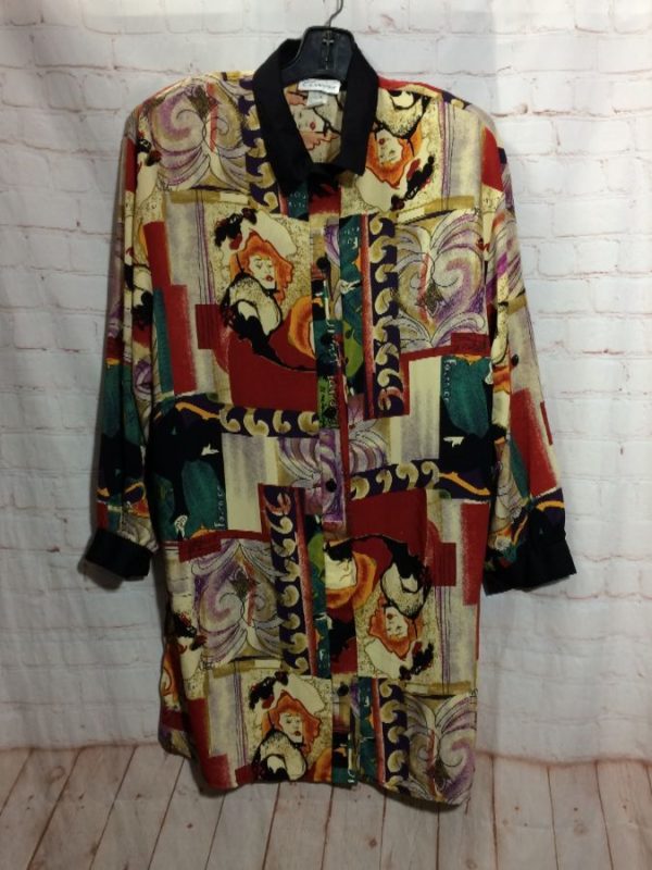 L Lawrence blouse/jacket, rayon, cardigan style, button-up, long length, Toulouse Lautrec print, solid contrasting colored collar/cuffs, black/rust/purple/green/orange/white, size XXL