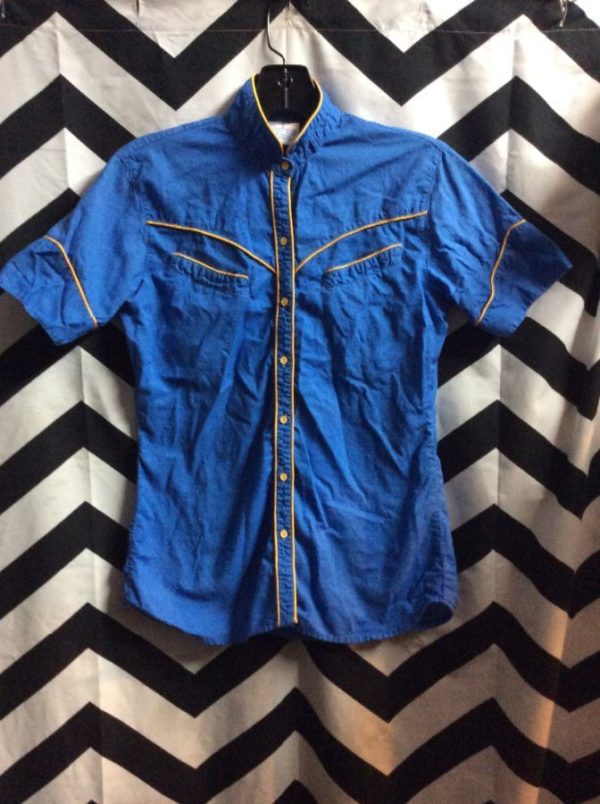Western shirt, button-up, Mandarin collar, contrasting piping trim, blue/yellow, size M women’s