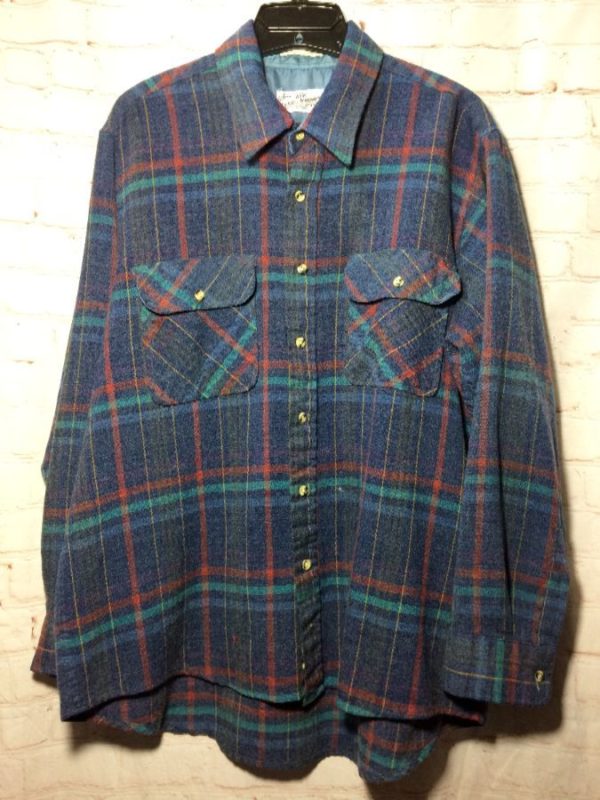 Sears Roebuck and Co. flannel shirt, wool, long sleeves, button-up, dark colored plaid design, 2 chest pockets, blue/red/green, size XL