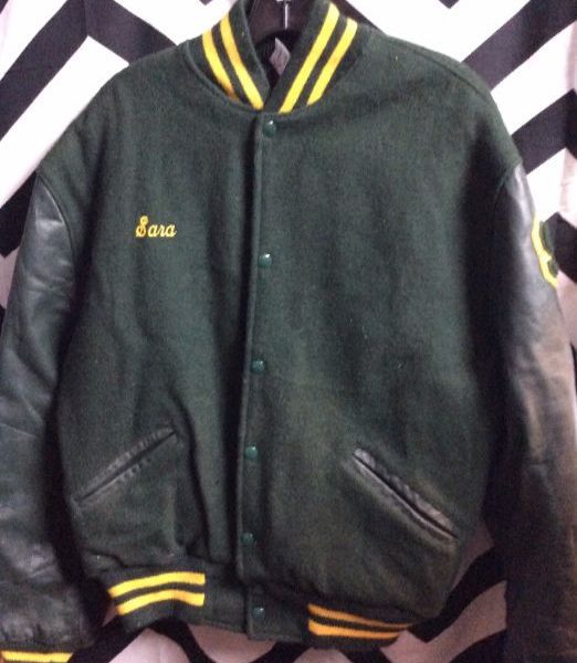 1997 Varsity jacket, Trojans, button-up, wool and leather, green/yellow, size L