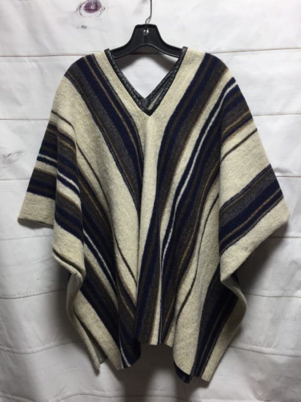7 FOR ALL MANKIND PONCHO, WOOL KNIT, LAMB LEATHER BINDING, V-NECK, VERTICAL STRIPED PATTERN, NAVY-BLUE/TAUPE, SIZE ONE SIZE