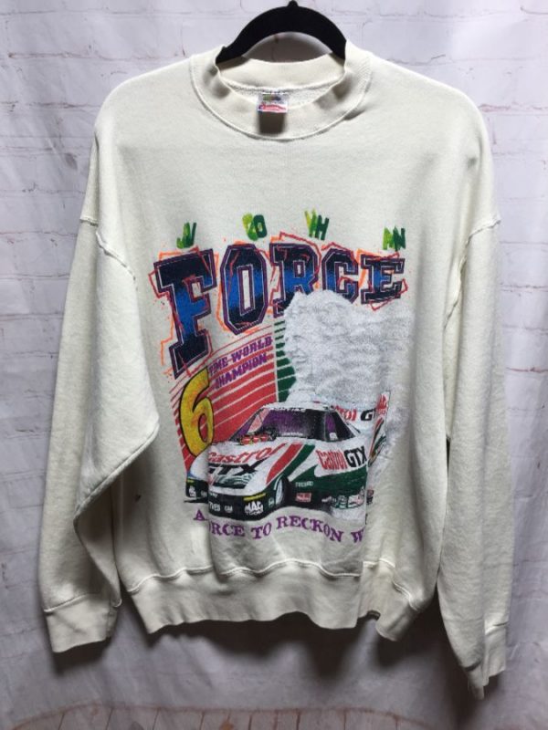 Fruit of the Loom sweatshirt, pullover, crew-neck, John Force, 6 Time Winston Drag Racing Champion, A Force To Reckon With, screen printed full front & full back design, off white/blue/green/red/yellow/black, size XL