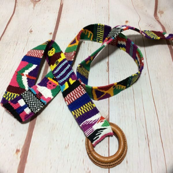 Belt, cotton, leather wrapped buckle, woven pattern with Aztec design, black/red/yellow/blue/purple/orange/green, size 34
