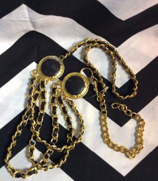 Belt, leather woven through chain, decorative medallions, black/gold color