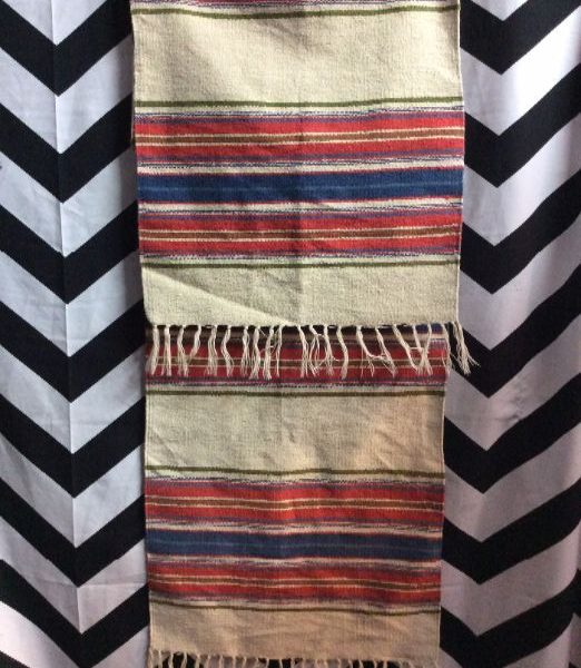 Table runner, woven textile, horizontal stripe design, creme/rust/blue, size 15″ x 70″