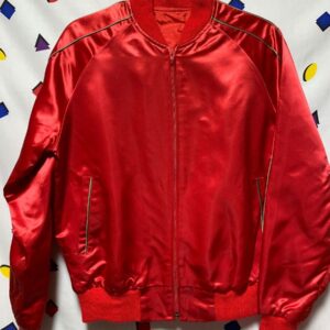UNIQUE VINTAGE REPURPOSED ACETATE SATIN ZIP-UP JACKET LARGE PAPA SMURF BACK PATCH, MADE IN LA