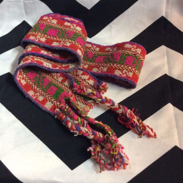 Belt, wool, wrap style, woven textile, pink/green/purple/white, size 50″