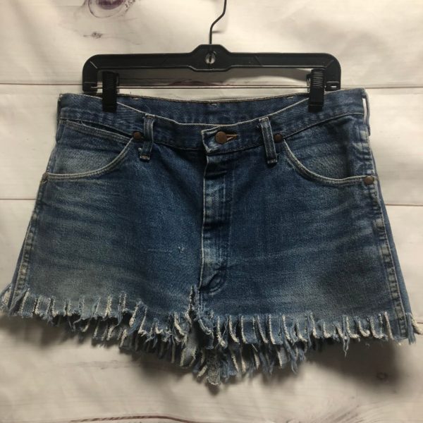 WRANGLER DENIM SKIRT, COTTON, CUT-OFF, ZIP-UP WAIST, SLIT/FRAYED HEM, BLUE, SIZE 34W AS IS