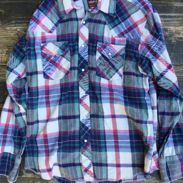 Wrangler Western flannel shirt, long sleeve, snap-up, 2 front pockets, plaid design, teal/pink/creme, size XL