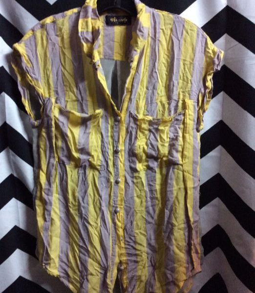 Blouse, short cuffed sleeves, button-up, front pockets, vertical striped design, sheer back, yellow/gray, size M